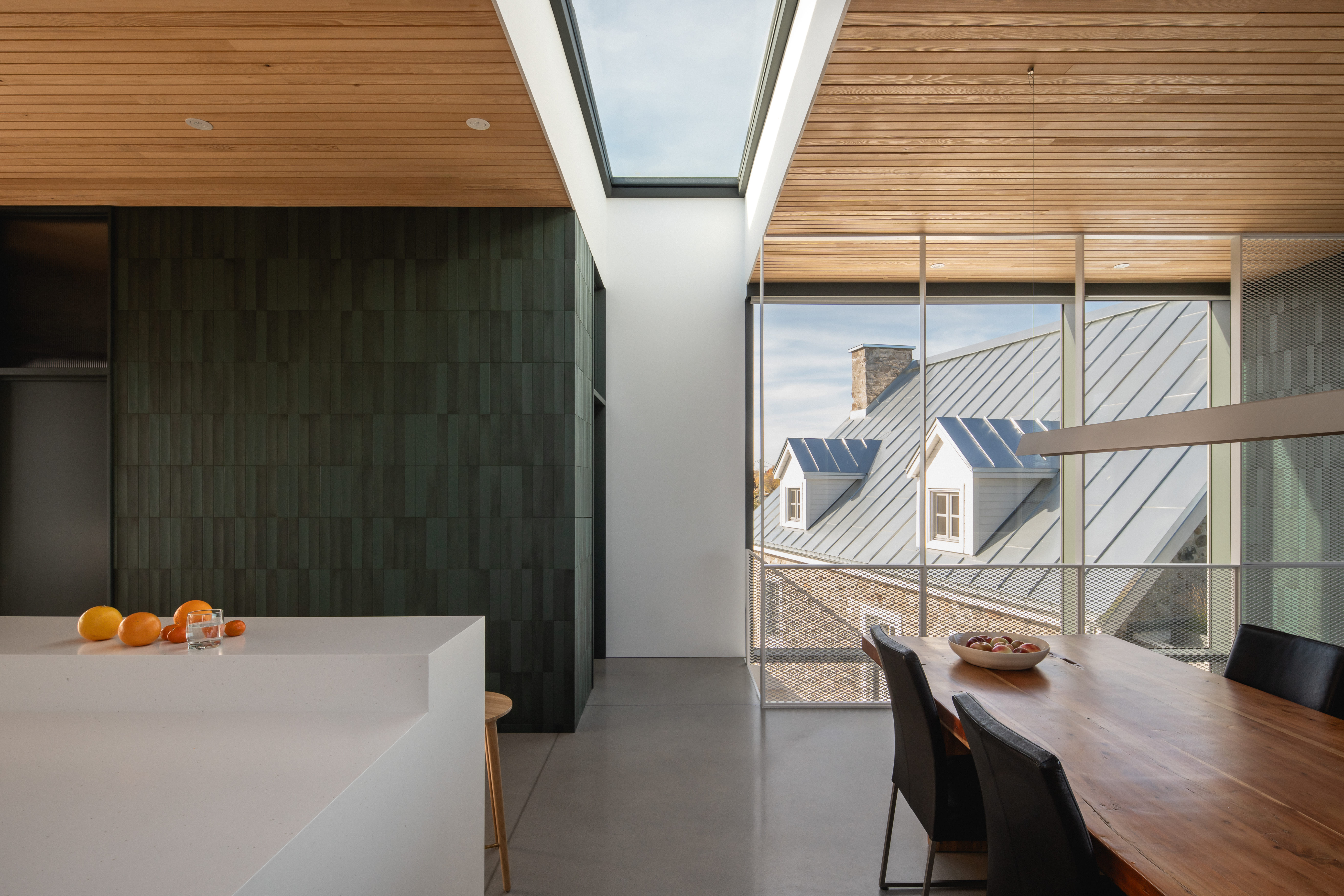 Located in the Rosemont-Petite-Patrie borough, the project consists in the restoration and extension of a “shoebox”. The house is structured around an interior courtyard bounded in front by the original house surmounted by a new floor and at the back by an addition of two floors connected at the front via a glass passageway.