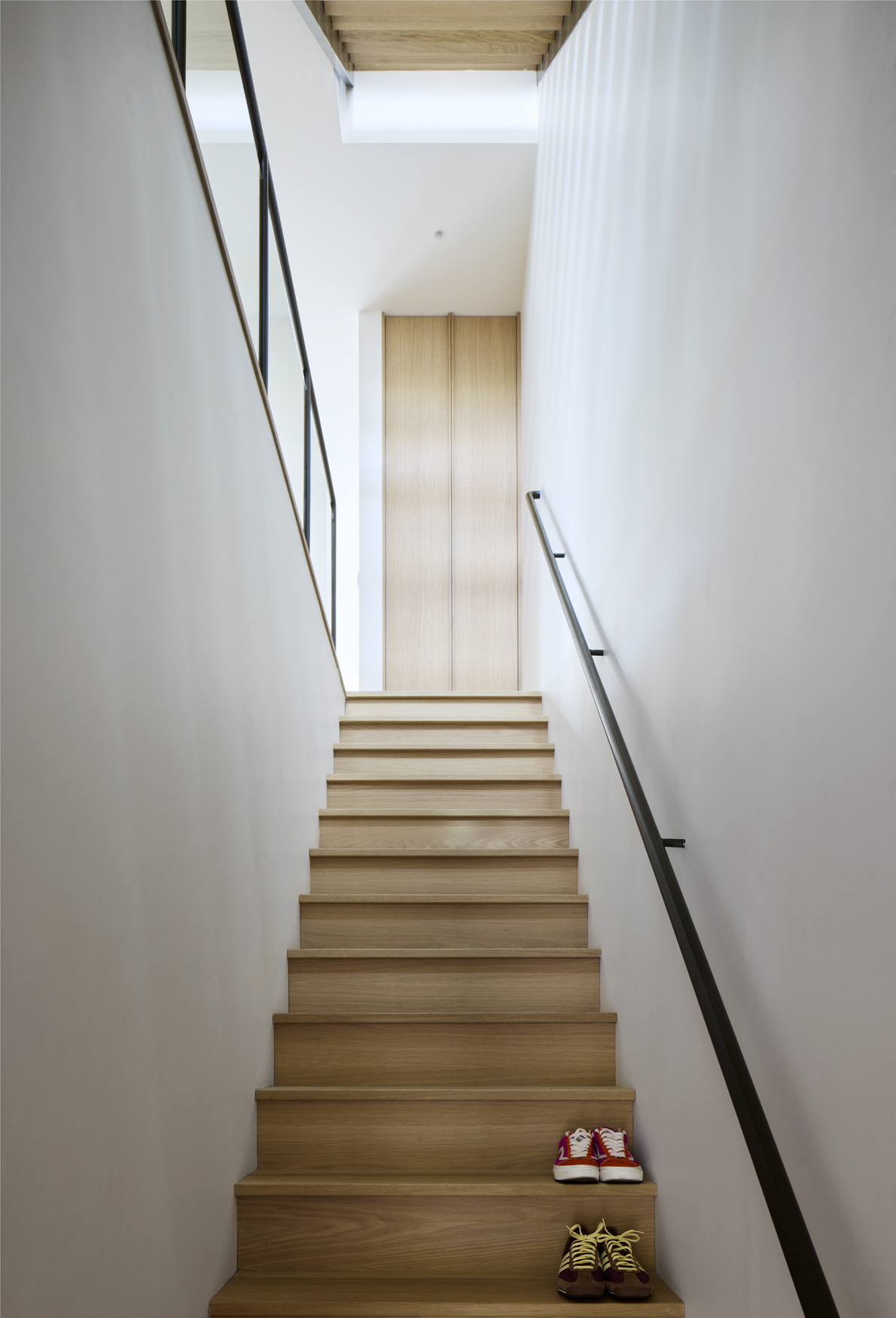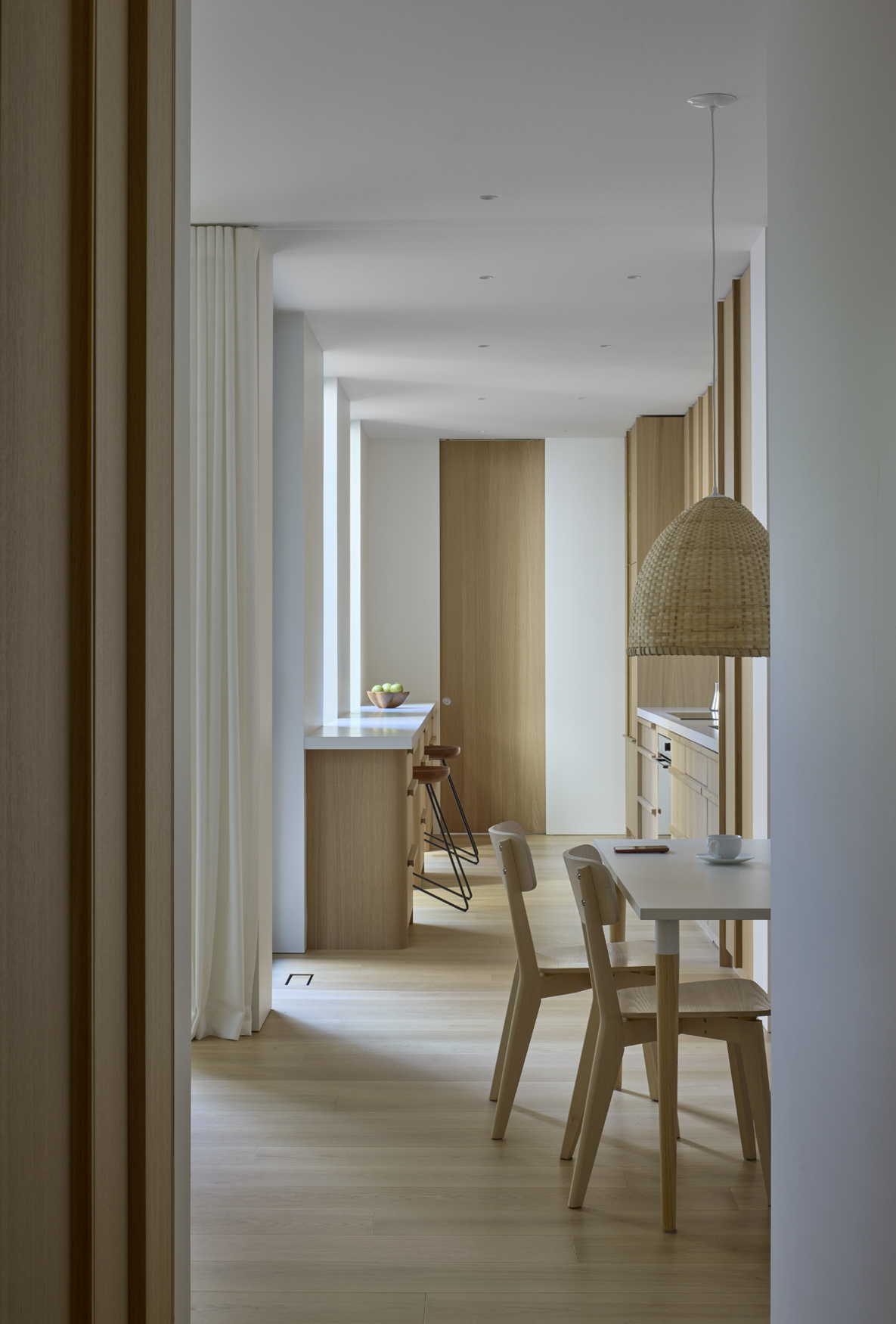 Cette transformation d’un ancien quadruplex en duplex, au cœur du Plateau, prend forme autour d’un projet familial : le rez-de-chaussée habité par le fils, l’étage par le père. Une rénovation urbaine complexe, combinant restauration du cachet d’origine et ouverture sur l’extérieur. Sur ce lot restreint, les espaces se déploient dans une succession d’ambiances où la lumière circule librement entre zones plus intimes et partagées, et où l’ébénisterie réalisée par Stele accompagne chaque transition avec finesse.